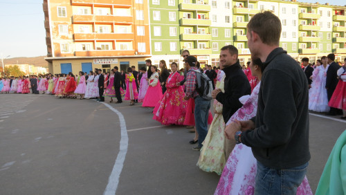 After climbing down this mountain, we went in to the town square to eat lunch and get ready for the gospel presentation, body worship and skit. Though we didn't have the permit necessary to do public presentations, we decided to step out in faith and see what God would do.