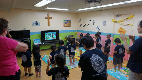 Teacher Godzilla (Stanley) and Teacher Peter Pan (Chris) acted out John the Baptist baptizing Jesus today,