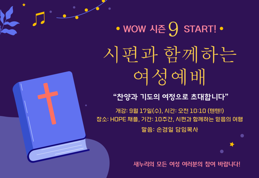 WOW 시즌9 여성예배 페이지 정보 작성자 NCBC 조회 20회 작성일 25-08-29 21:41 목록 본문 이전글다락방 철야 기도회 25.09.12 다음글Saenuri Youth Orchestra & Choir - Fall 2025 25.08.22 댓글 0 댓글목록 등록된 댓글이 없습니다. 목록